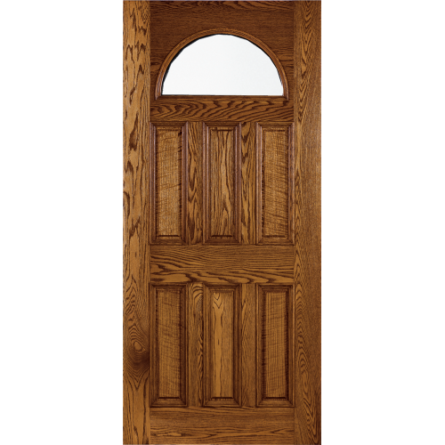 This custom wood exterior door features a round top glass lite atop six even raised wood panels for classic appeal. A myriad of wood species, finishes and decorative glass options make these doors uniquely yours.