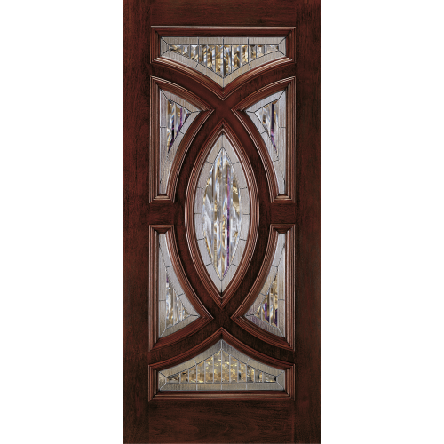 A stunning fiberglass exterior door with curved arc design, distinctive molding and opulent decorative glass. Double to create an impactful and artistic front entry. Handcrafted for exceptional beauty. Choose from a wide range of woodgrain, paint and iron look finishes, decorative accents and glass options.