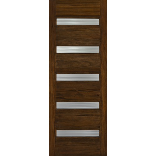 The five identical horizontal glass panels and substantial wood detail of this custom wood exterior door give it a thoroughly modern design. A myriad of wood species, finishes and decorative glass options make these doors uniquely yours.