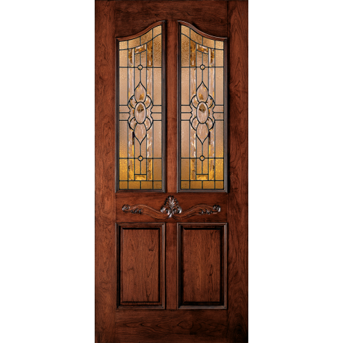 Traditional with ornate touches, this custom wood exterior door features two decorative glass lites with caming atop a gorgeous carved design and two raised wood panels. A myriad of wood species, finishes and decorative glass options make these doors uniquely yours.