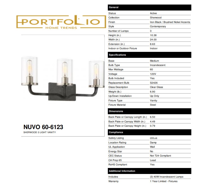 Sherwood 3 Light 24 inch Iron Black and Brushed Nickel Accents Vanity Light Wall Light
