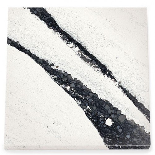 A white background is intersected with bold, translucent black and charcoal veins with muted light gray spatters and cross veins dispersed throughout.