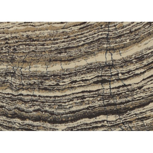 Graceful striations of tan, walnut-brown, cream, black, and gray flow in parallel layers with dark veins that cut across the grain.
