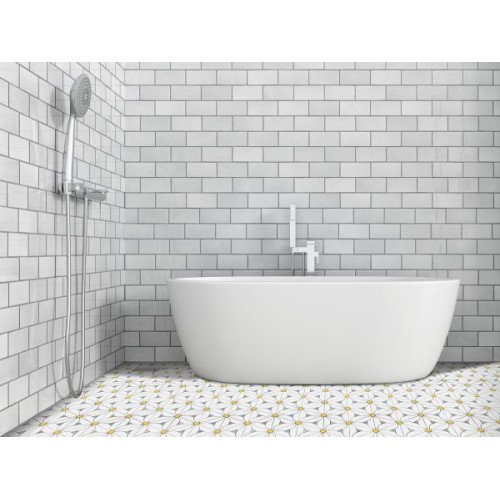 The Golden Flower is a beautiful mosaic certain to make every room feel more like home. Cut using a state of the art water jet system; the cheerful flower shapes are uniquely designed to be easy to interlock with one another without breaking a sweat. The combination of premium white marble and brass metal is sure to look clean and stylish for years to come.