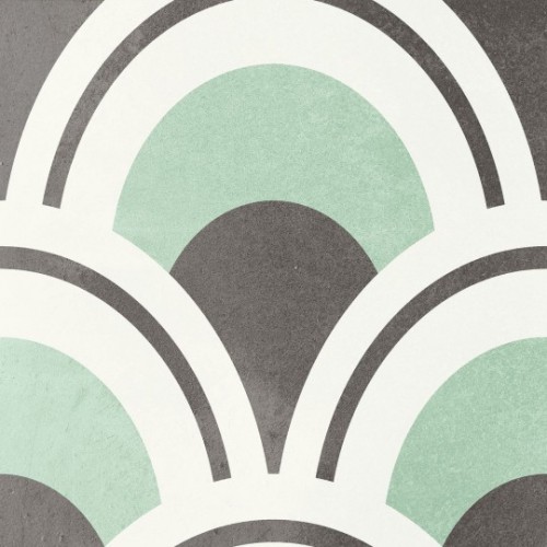 14.7×14.7 decorated porcelain tile. Its fish scale geometric design enables countless arrangements. With a smooth uneven texture that mimics the imperfections of handcrafted clay.