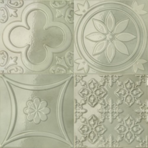 15×15 cm green embossed tiles with a gloss finish, with subtle variations in color. It has four different reliefs that are supplied in random mixes.