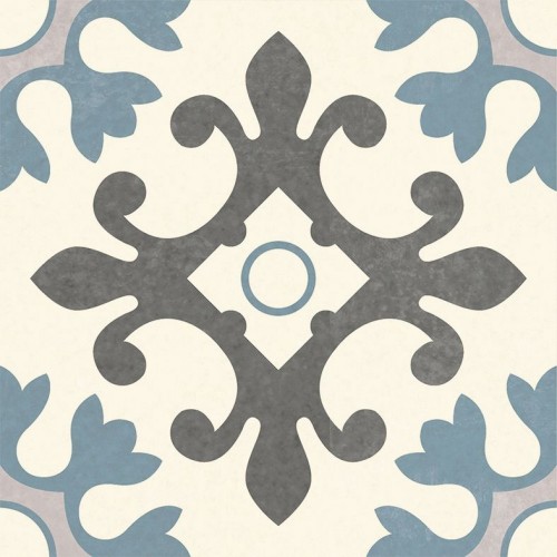 20×20 porcelain-effect hydraulic tiles in an elegant mosaic in shades of off-white, blue, pearl gray and anthracite.
