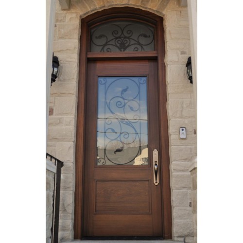 Wood single 2 panel door with decoarative glass and transom