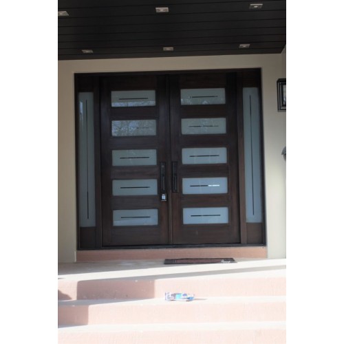 Wood double door modern style 5 panel with glass inserts and sidelights